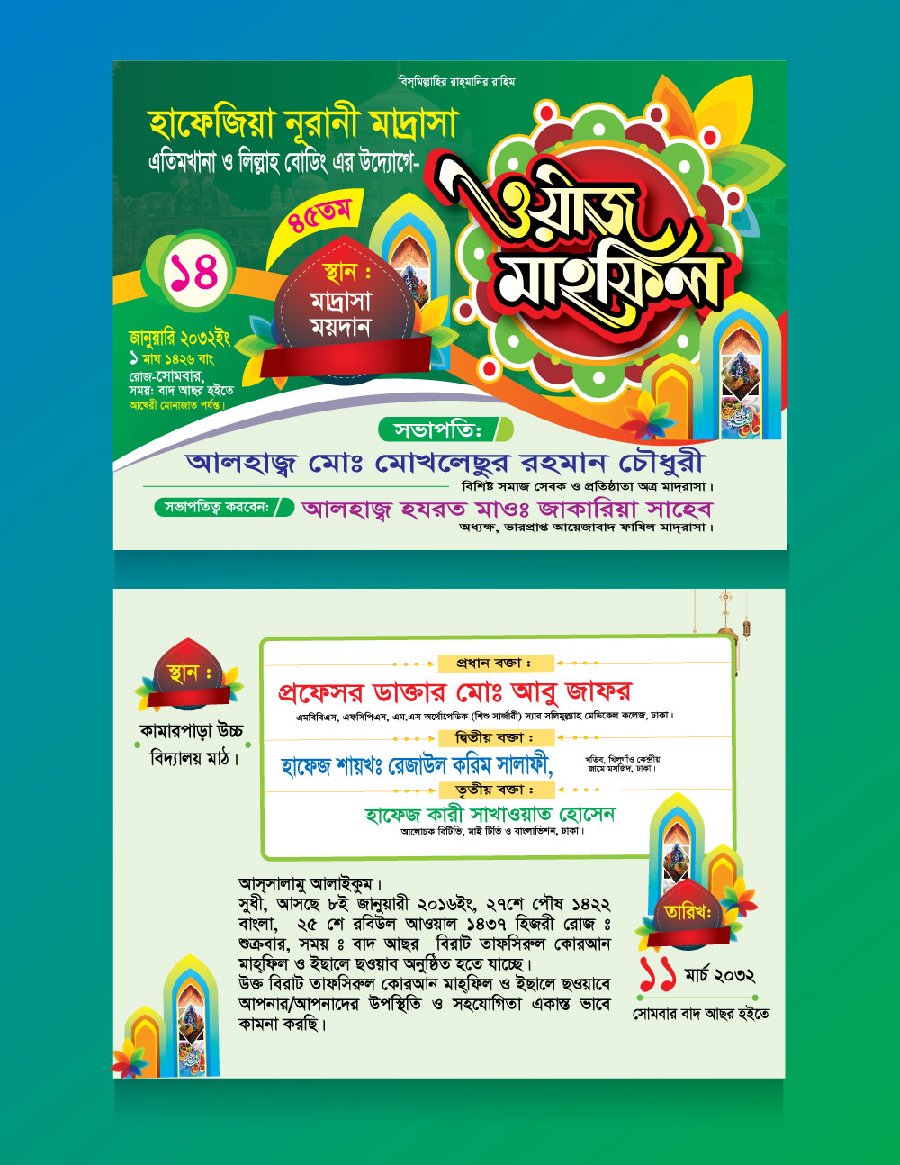 Bring spirituality and elegance together with this beautifully crafted Bengali Waz Mahfil Event Poster Design Template. Perfect for promoting Islamic events, waz mahfils, milad mahfils, mosque gatherings, or religious announcements.
