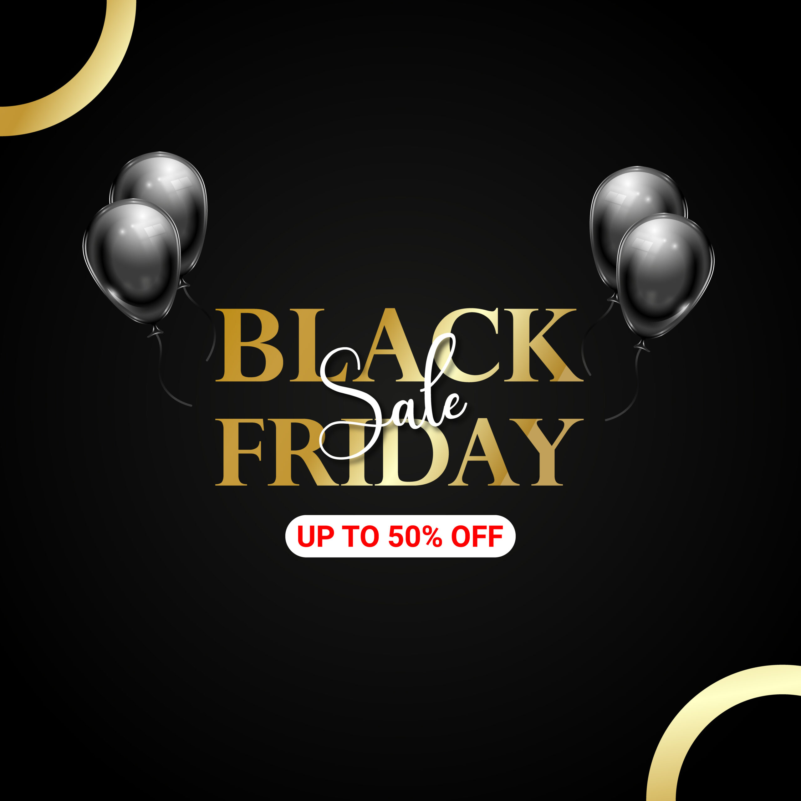 Capture attention with our premium Black Friday Sale banner template, designed to maximize your holiday season conversions. This eye-catching graphic features luxurious golden typography for “Black Friday” and an elegant cursive “Sale” with subtle black glossy balloons, all set against a sophisticated dark background. The prominent “UP TO 50% OFF” call-to-action ensures your customers immediately grasp the value.